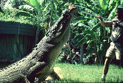 Обитает этот страшный и коварный хищник на широком пространстве от Индии до Австралии. Встретить его можно в соленой воде (его еще называют морским крокодилом), но вот при встрече легко принять за бревно. Терпения этим крокодилам не занимать. Но когда наступает удачный момент – их реакция столь стремительна, что спастись крайне проблематично. Своих жертв крокодилы затаскивают под воду и затем разрывают на части.